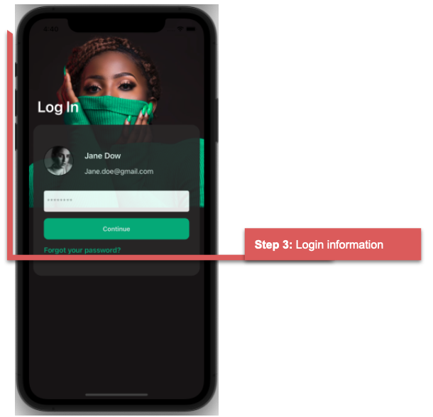 Finally, we add the password field, the Continue button to send the information (using the Syncfusion Xamarin.Forms Button), and the label to retrieve a forgotten password.