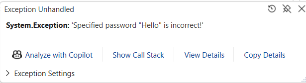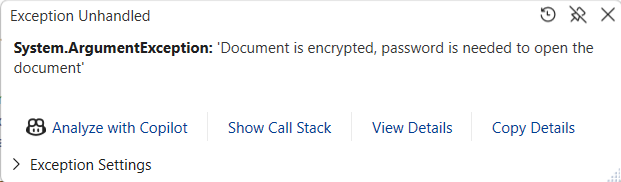 If you try to open the document with an incorrect password, the following exception will be thrown.