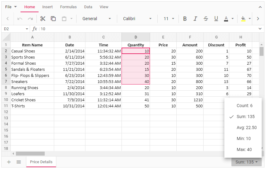 Quickly check the sum, average, and count for the selected cells or range in a sheet.
