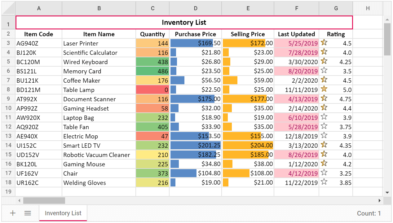 Please refer to the following screenshot. The cells in the column Quantity are formatted based on the value.