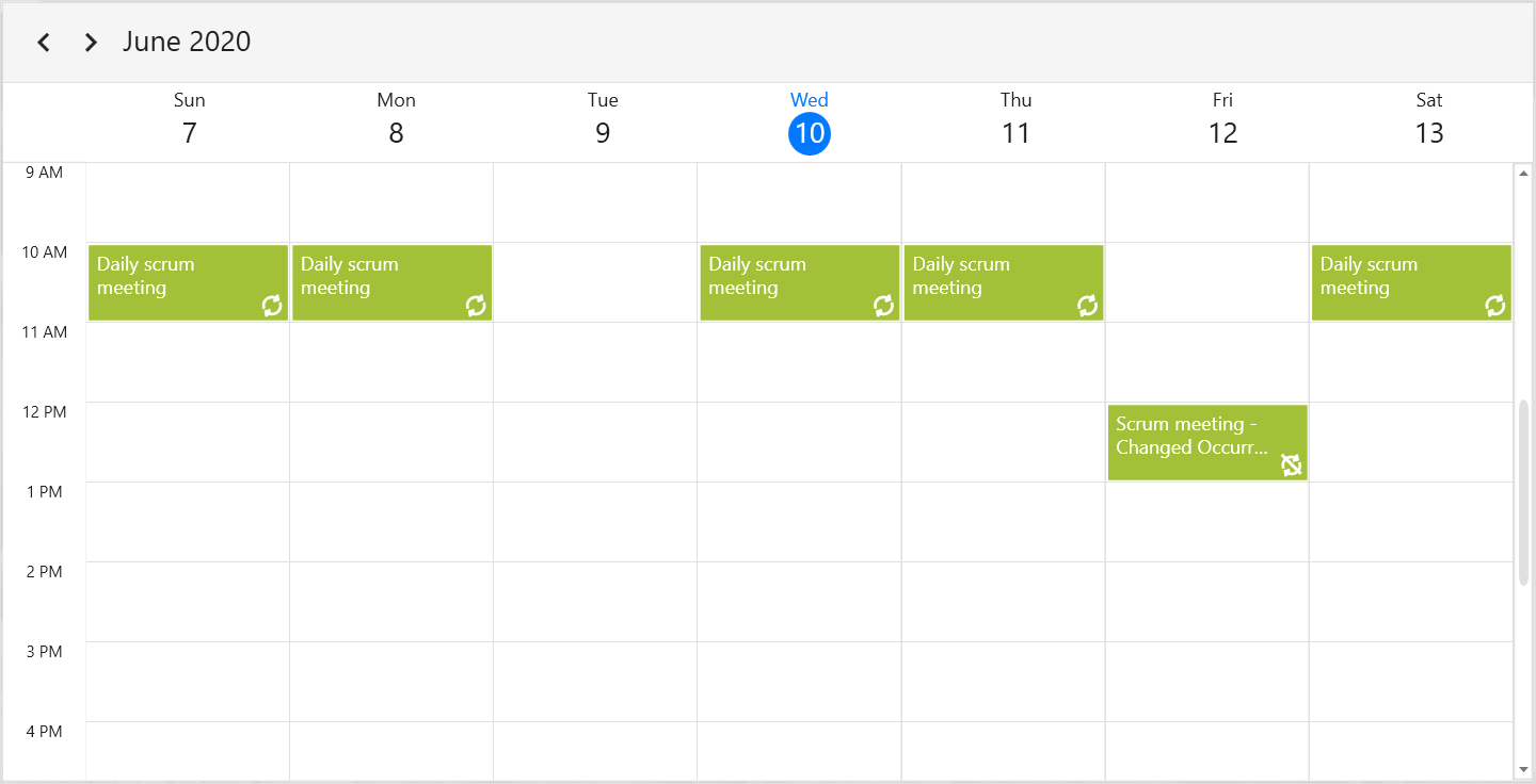 - Recursive exception dates: To remove or modify the details of any occurrence appointment that is an exception to the recurrence pattern. This can be done by adding exception dates to a scheduler appointment.
