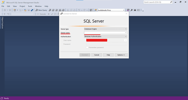 - Now, the SQL Server dialog box will appear. Your machine name will appear in the Server Name field. Make sure that Windows Authentication is chosen as the Authentication type. Then, select the Connect option.