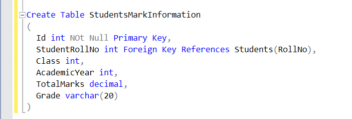 Create table <<table name>> ( <<column name1>> datatype not null primary key, <<column name2>> datatype foreign key references <<existing table name>>(<<existing column name>>), <<column name3>> datatype, <<column name4>> datatype )