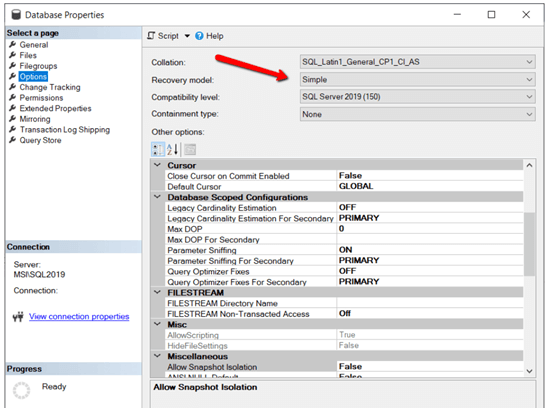 - Now, the Database Properties window will appear. In that, select Options from the left pane. Then, it will display the current recovery model in your database.