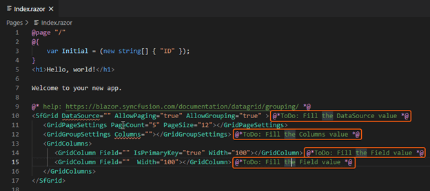 - After adding the Syncfusion Blazor component code in the Razor file, use the tab key to fill the values required to render the component. The comments in the code snippet will help you find the values to be filled.