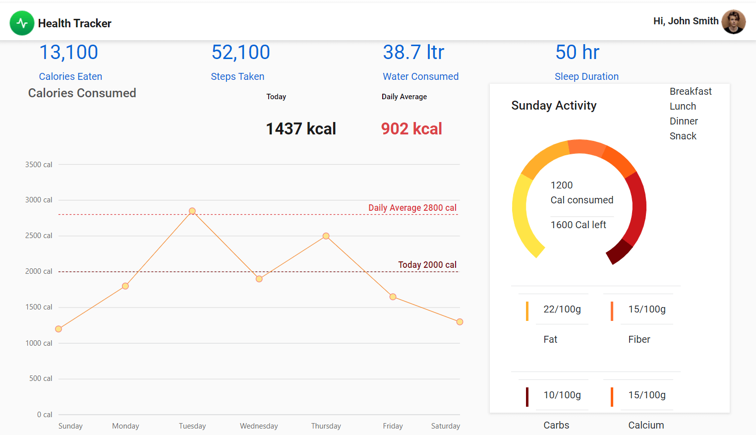 This app is used to track and visualize health data, such as calories consumed, and daily activities like steps taken, water consumption, and sleep duration.