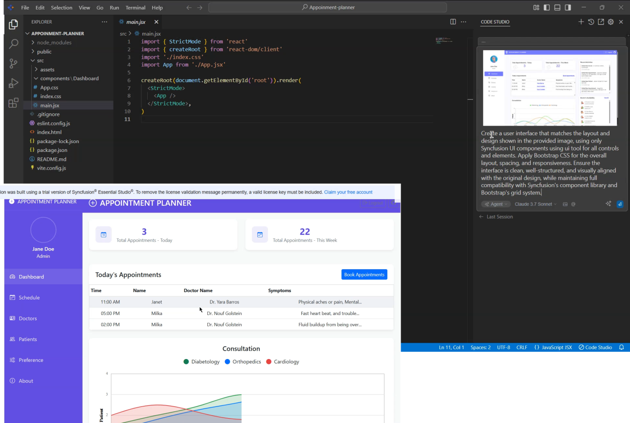 TL;DR: Syncfusion® Code Studio is a blazing-fast, AI-powered code editor built for enterprise developers. With four intelligent modes, Chat, Edit, Agent, and Autocomplete, it helps teams write, refactor, and generate UI code in seconds. The Code Studio works out of the box, supports any LLM, lets you bring your docs as context, and extends seamlessly with your MCP. No Syncfusion license required.