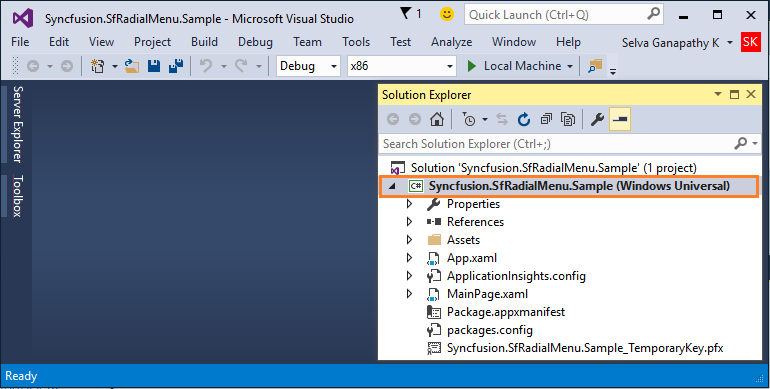 2.      Create a Blank App with the desired name and location. This generates a single project as shown in the following image. The Windows 8 Universal Platform generates the Windows project, Windows Phone project, and shared project that creates two apps for Windows and Windows phone separately. Here, it generates only one app that can run across all Windows devices. The following code adds the Syncfusion SfRadialMenu to the application.