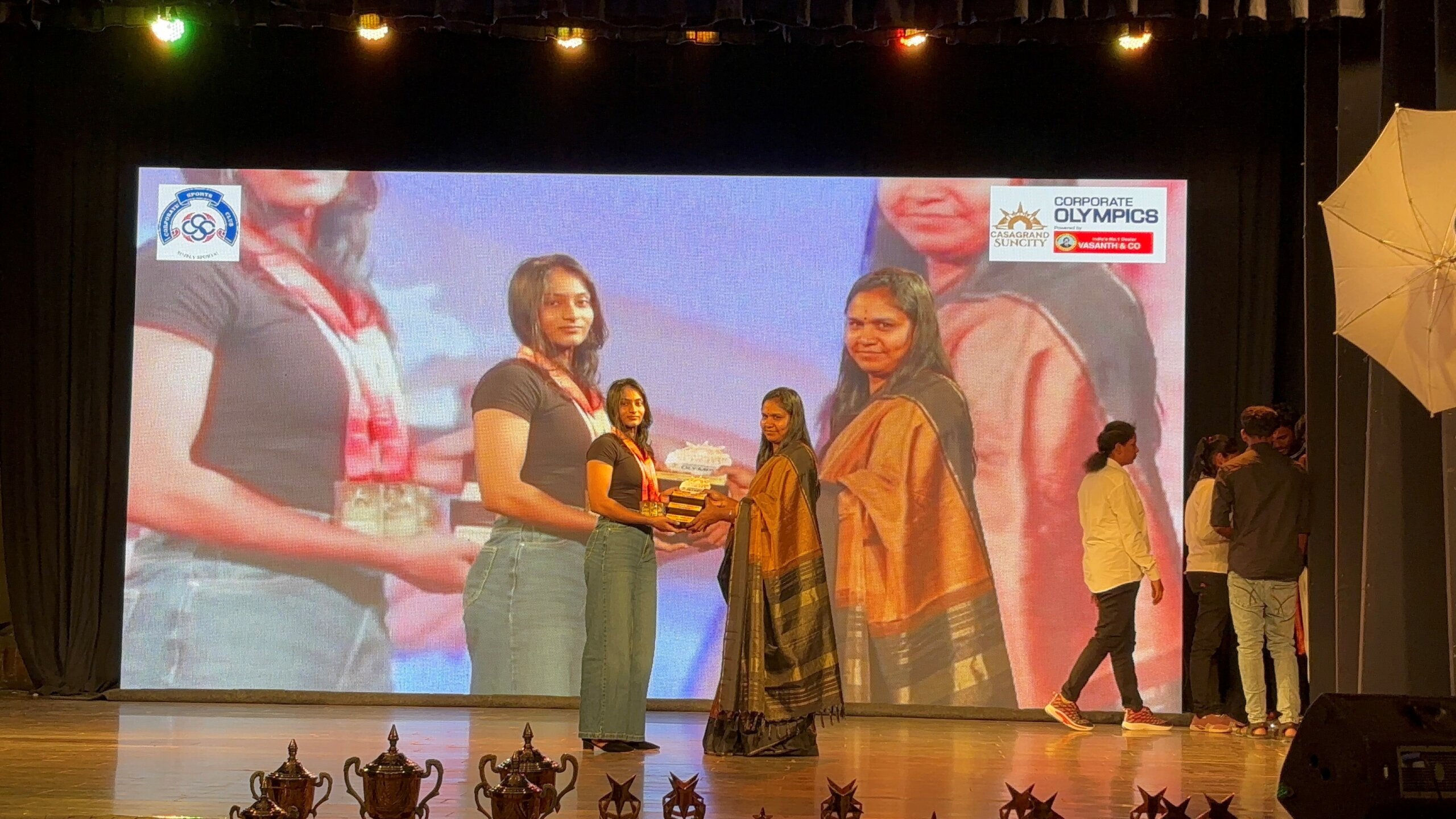 Surabi Potramarai being honored with an award Surabi Potramarai at the Corporate Olympics event