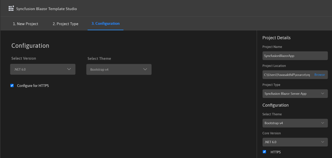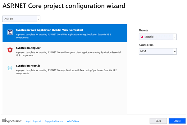 When creating an app, choose the .NET 6.0 option to create projects with Syncfusion components and .NET 6.0 support.