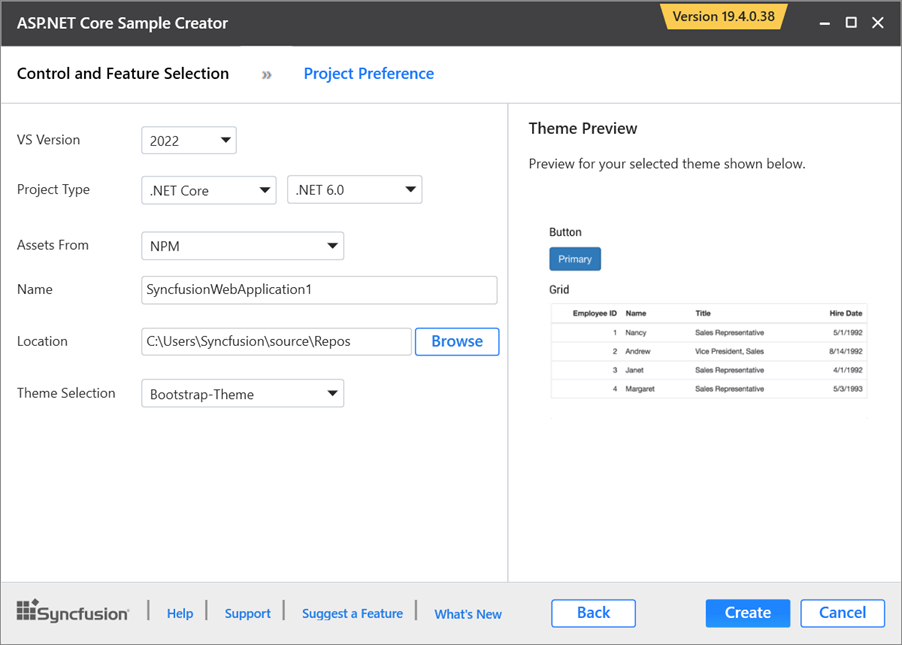The Syncfusion Sample Creator is a tool that lets you create Syncfusion ASP.NET Core (Essential JS 2) projects with sample code for the required Syncfusion controls’ features and configurations. This is now available with .NET 6.0 support.