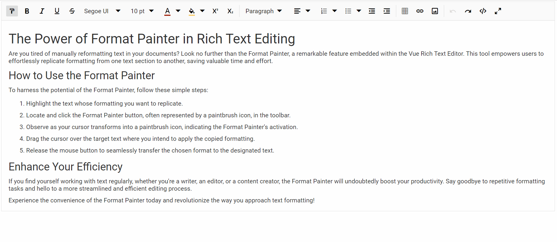 Are you tired of manually reformatting text in your documents? Boost your productivity with the Format Painter, a game-changer for Vue Rich Text Editor users. The Format Painter is a vital feature of the Vue Rich Text Editor that enables you to duplicate the formatting from one text segment and apply it to another. This feature is useful when you want to maintain consistency in your document’s formatting or when dealing with large amounts of text.