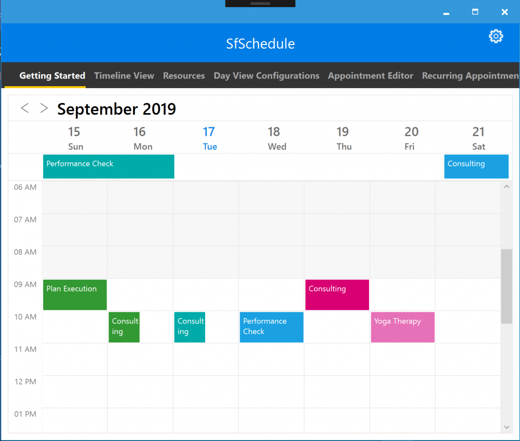 The Scheduler control provides common scheduling features for creating and managing appointments. It has interactive, user-friendly features for performing common operations such as selection and navigation. Get hands-on experience with our Scheduler control in Xamarin.Forms WPF with the samples available in this GitHub location.