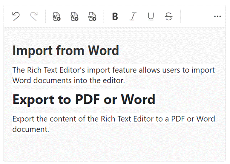 - Import/export: Effortlessly export content to PDF or Word or import Word documents for editing within the editor.