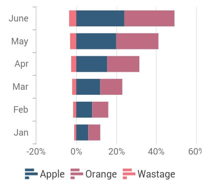 The stacked bar chart is similar to the stacked column chart, as it allows you to plot data points on top of each other, but in horizontal bars. The following code illustrates how to render the stacked bar chart.