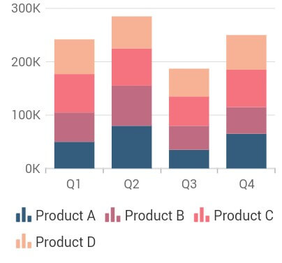 The stacked column chart allows you to plot data points on top of each other in vertical bars to allow part-to-whole comparisons. The following code illustrates how to render the stacked column chart.