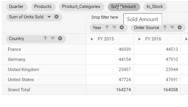 - Fields Panel: The fields panel located above the grouping bar displays the fields available in the data source but that are not bound to the report. The fields can be dragged into the appropriate axes. Any field removed from any axis will automatically be added to the fields panel. For more information, refer to the Grouping Bar in the Blazor Pivot Table Component demo.