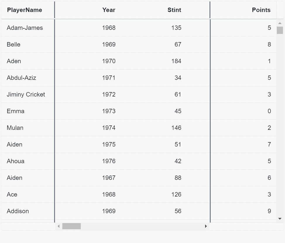 - Frozen columns with virtualization: Load a large volume of data without any performance degradation in a frozen-columns-enabled grid. With this feature, you can load data on demand when scrolling vertically.