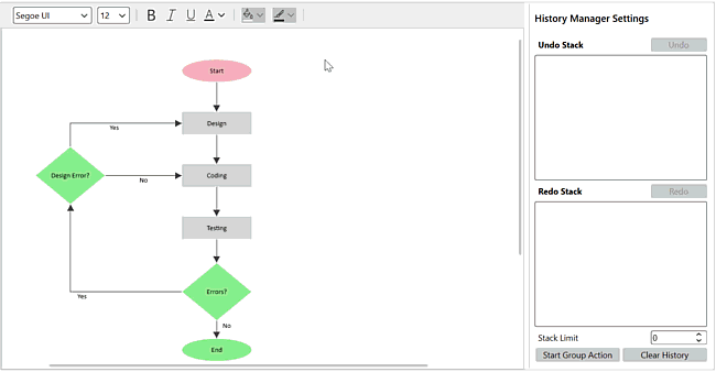 View, delete and limit the operations recorded in the undo and redo stack. You can also group diagram actions and store them as a single entry in the history manager.
