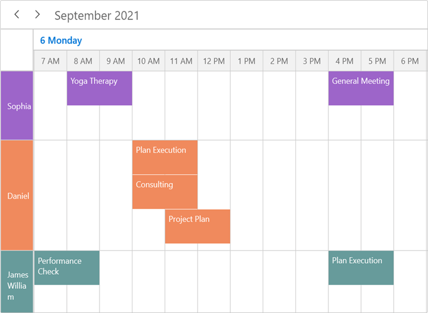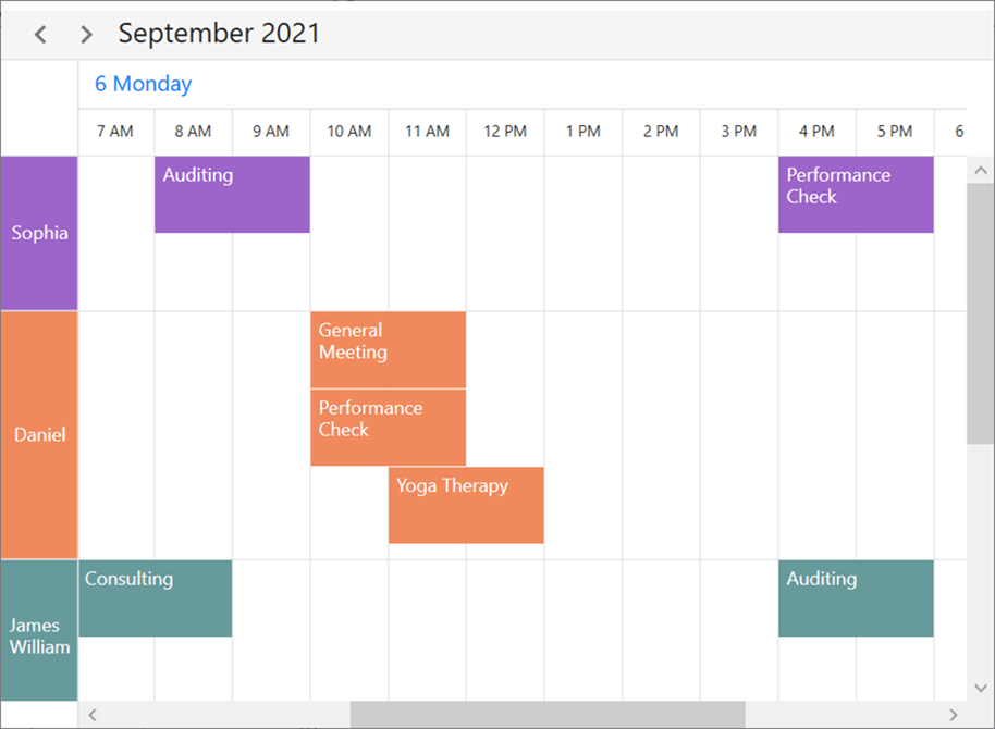 All the different scheduler view types can be listed in the scheduler header to quickly navigate among them. You can show only specific view types if needed.