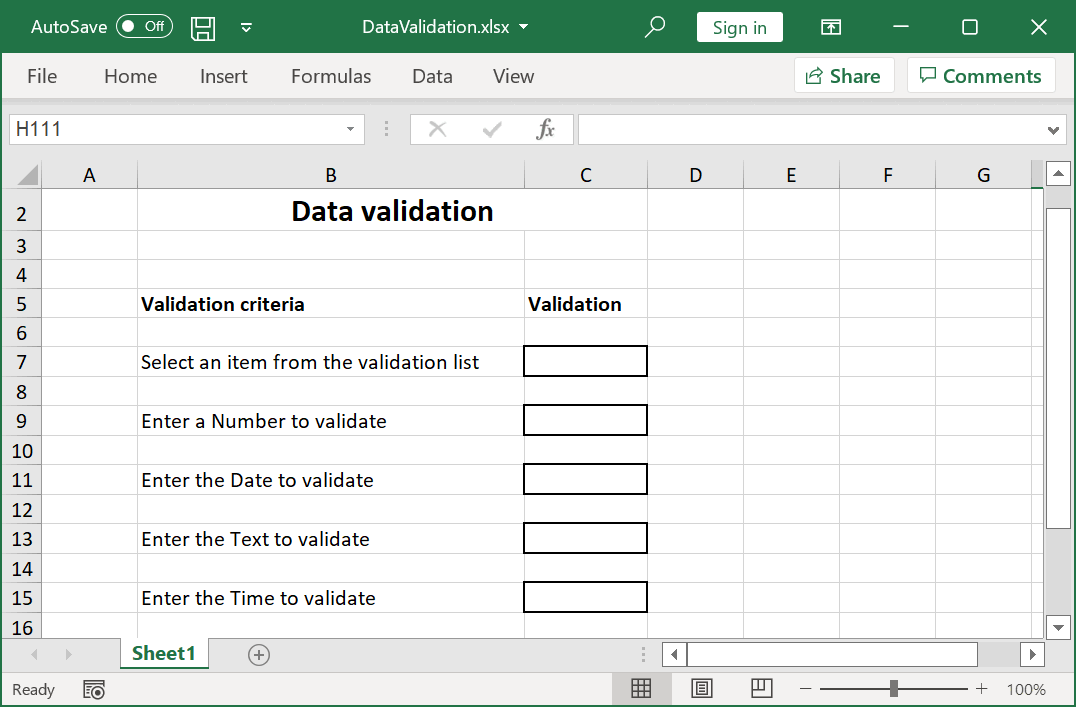 - Data validation allows users to control the type of data entered into a cell. This feature helps to ensure that only valid information is entered into a worksheet by creating validation rules. You can implement the following restrictions using data validation: