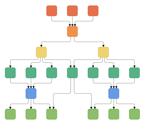 A complex hierarchical tree layout arranges nodes in a tree-like structure, where the child node can have more than one parent. This layout is an extended version of the hierarchical tree layout.