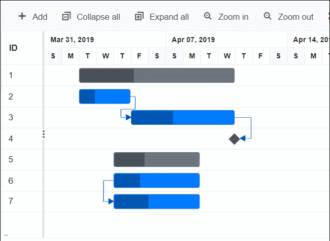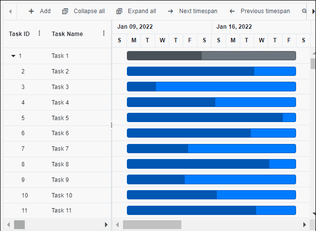 Bind ObservableCollection-type data to the Gantt Chart component. INotifyPropertyChanged support was added to all Gantt Chart operations.