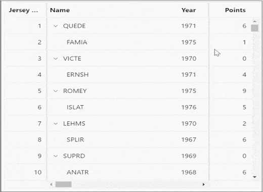 When row and column virtualization features are enabled, you can freeze specific columns while scrolling through other columns.