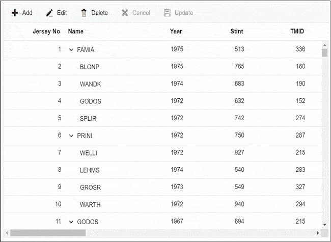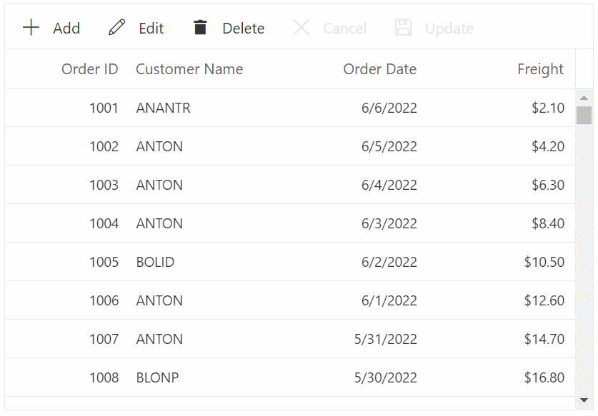 Perform CRUD operations directly on rows in the current viewport when the row and column virtualization features are enabled.