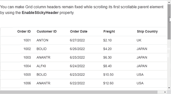 Note: For more details, refer to the Example of Sticky Header in Blazor DataGrid Component.