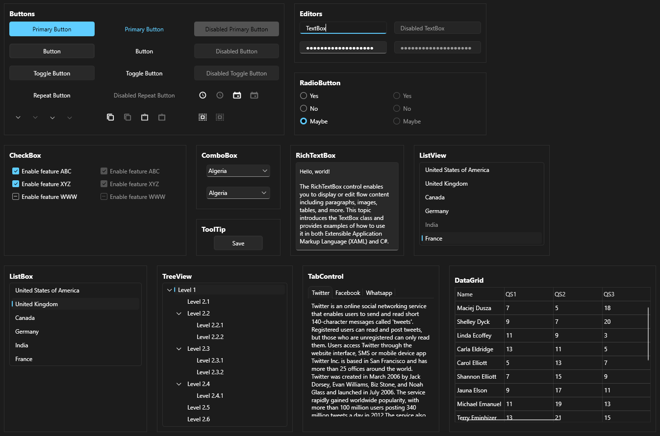 The following are some of the framework and Syncfusion controls with Windows 11 light and dark themes.
