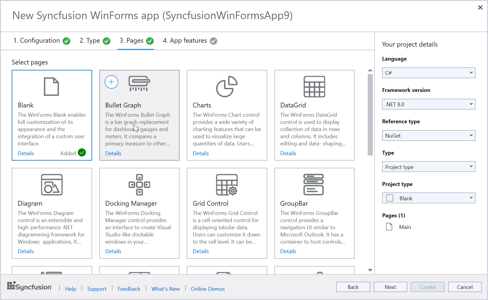 - In the Pages tab, select the Syncfusion WinForms controls you want to include in your app by selecting them.