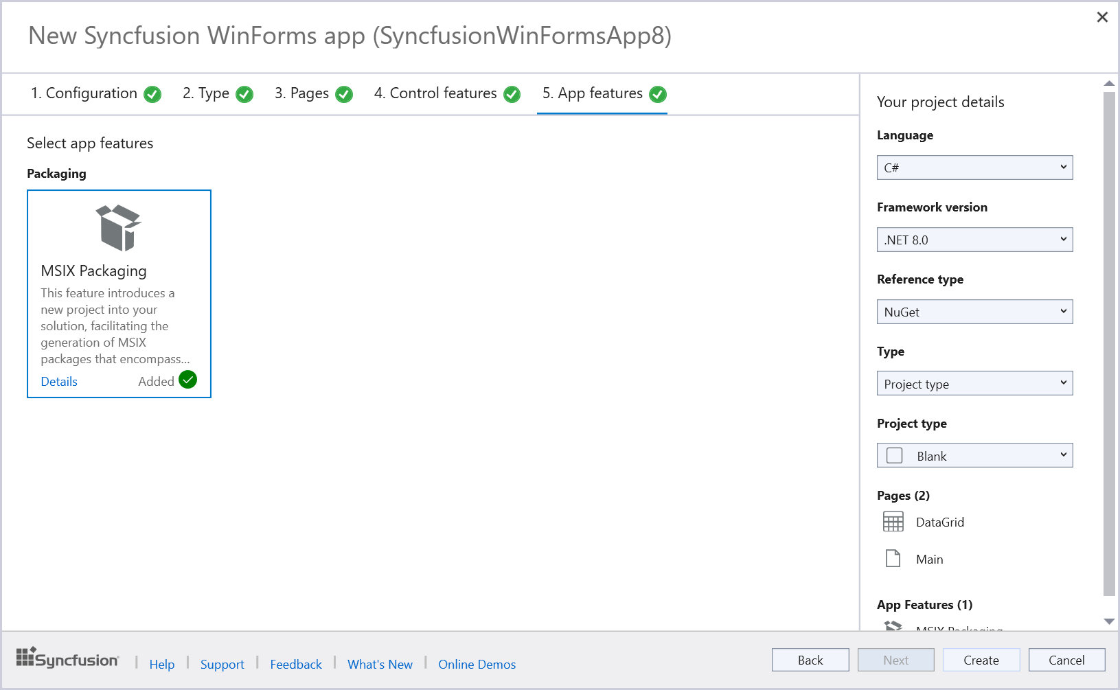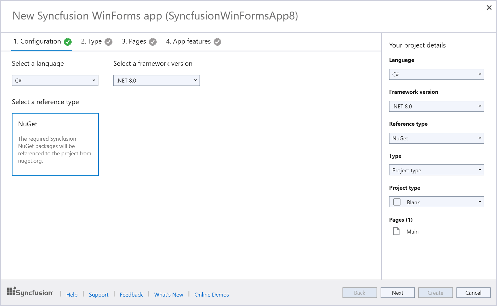 - After configuring the app, click the Create button. Then, the Syncfusion WinForms project will be created with the necessary files, Syncfusion WinForms assemblies, and NuGet packages.
