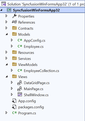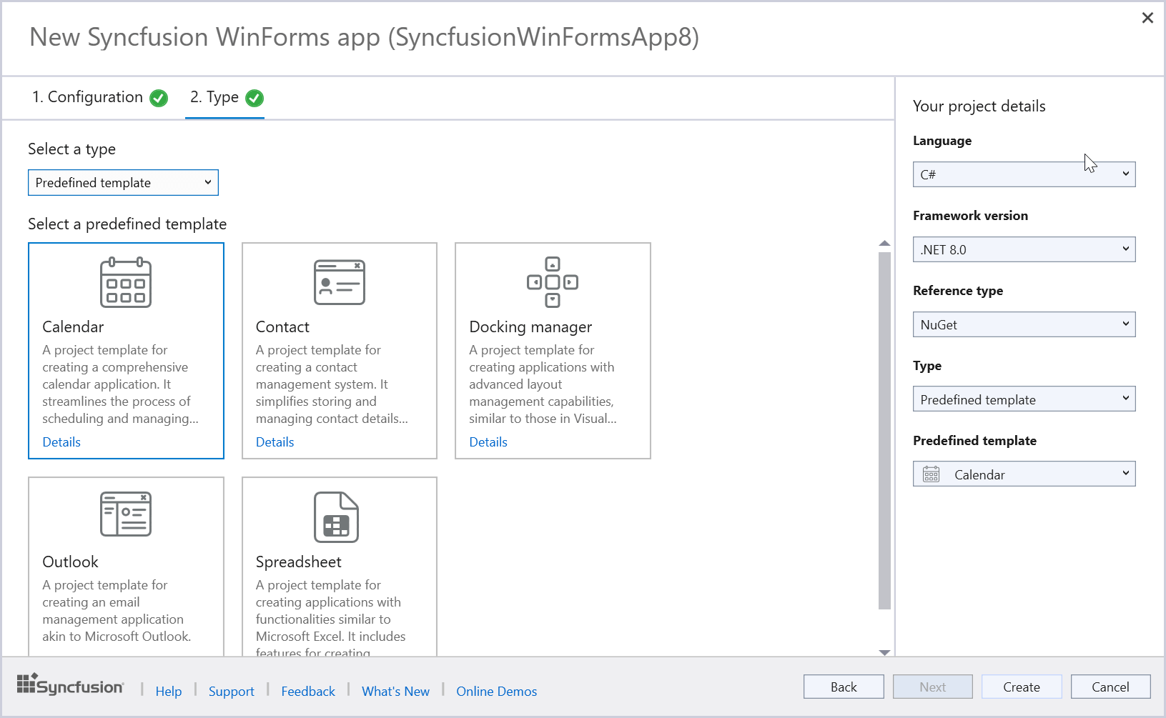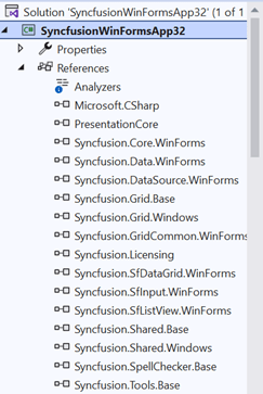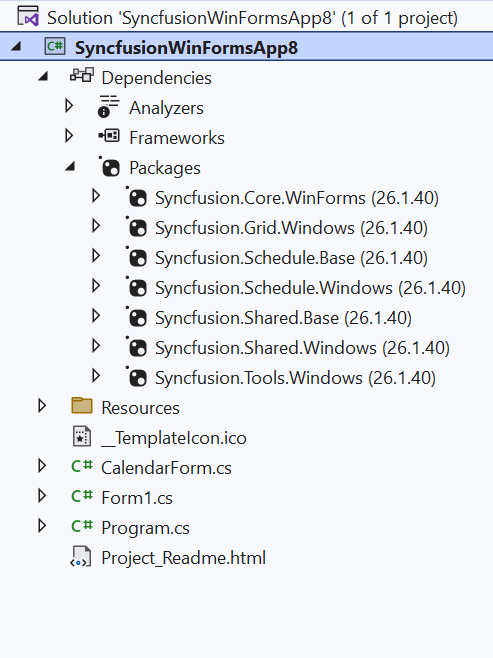 - After choosing the project configuration options in the project configuration wizard, click the Create button. Then, the Syncfusion WinForms project will be created with the necessary files, Syncfusion WinForms assemblies, and NuGet packages.Â