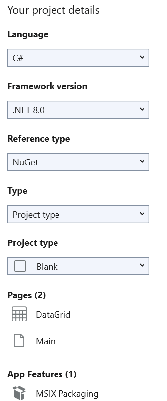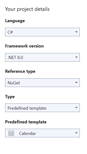 In the project details pane, you have the option to change the selected language, framework version, reference type, type, and predefined template.