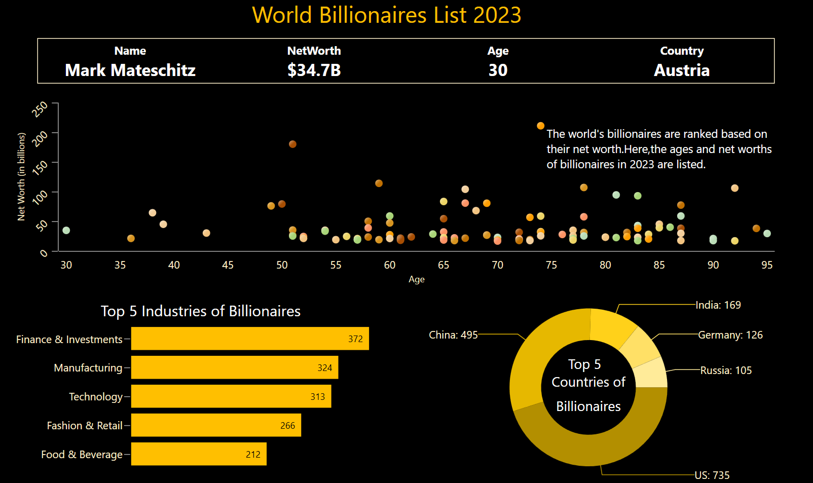 - Doughnut chart: This shows the top five countries with the most billionaires in 2023.