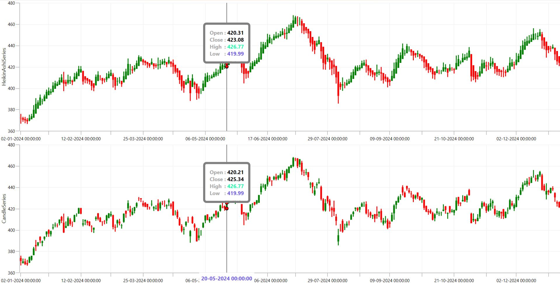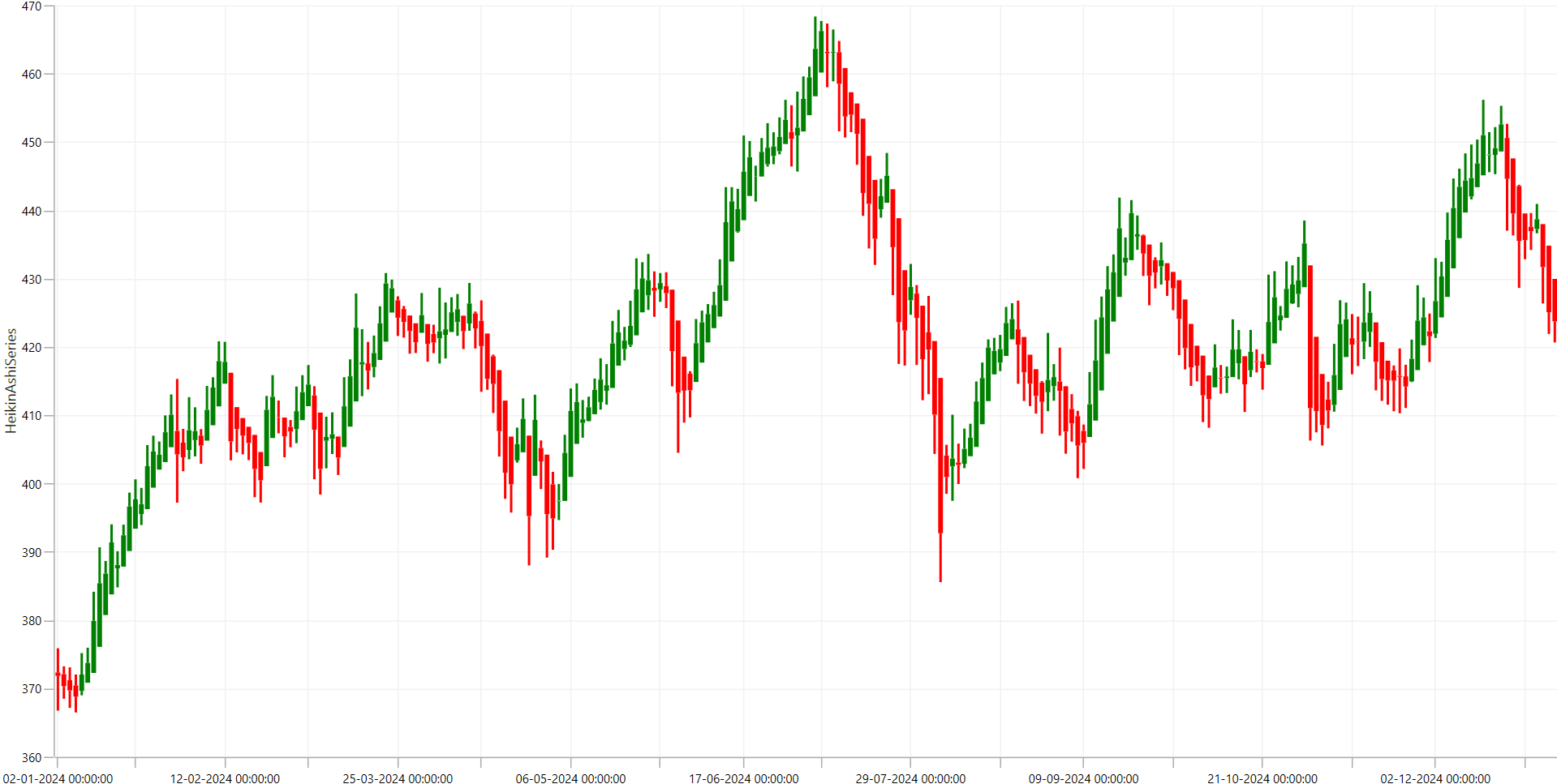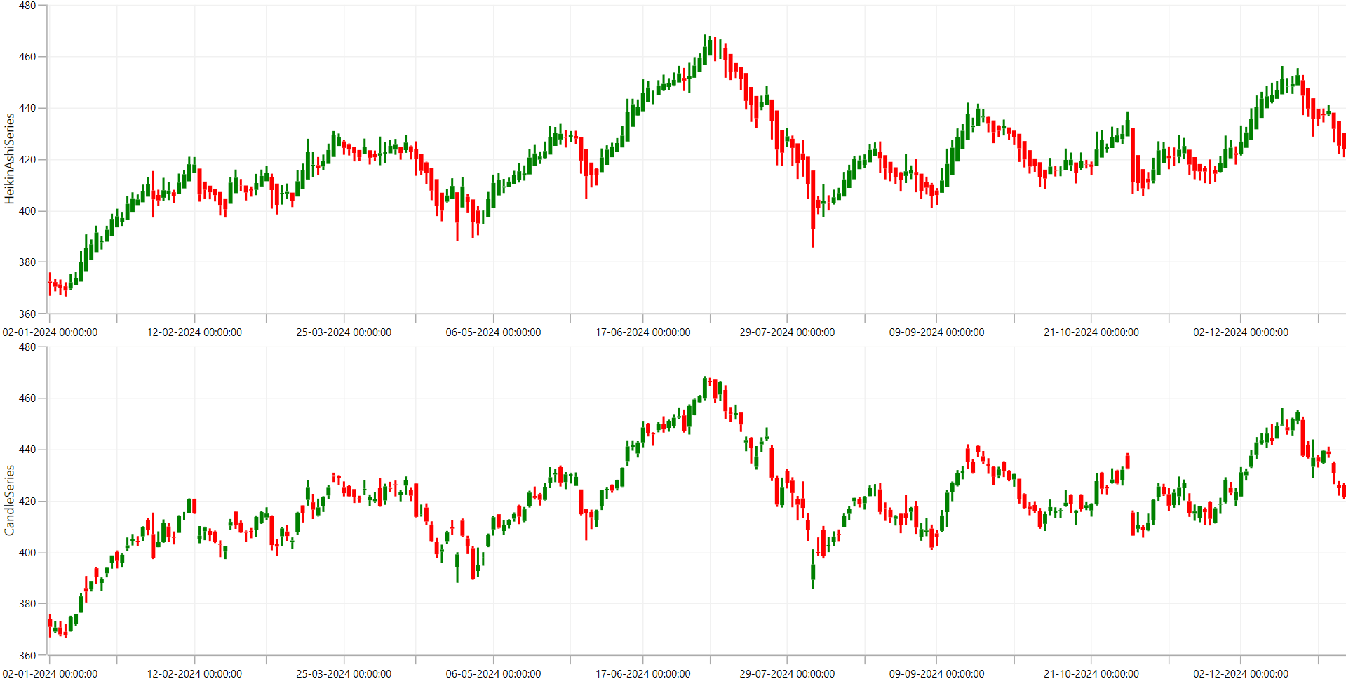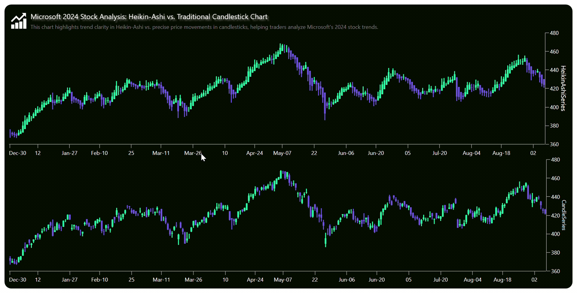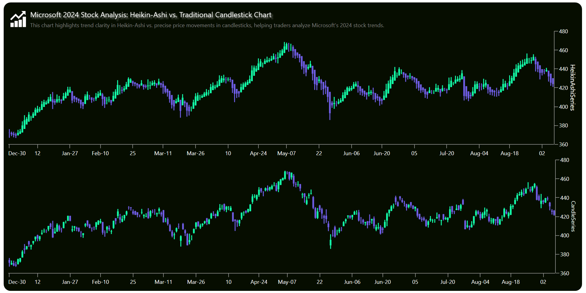 TL;DR: Let’s see how to create a Heikin-Ashi Chart using WPF Charts control and compare it with the traditional Candlestick Chart. We’ll use Microsoft’s 2024 stock data to visualize market trends and spot differences in price representation. Implement Heikin-Ashi calculations by extending the CandleSeries with custom formulas. Render both charts side by side for clearer trend analysis and improved decision-making.