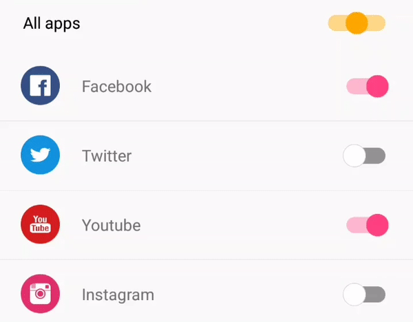 Our Xamarin.Forms Switch is a little different from common switches. Apart from the usual on and off states, we offer an additional state called indeterminate. For instance, in the following image of an app notification module, users can turn on or off the notifications of apps installed. A global switch can turn on or off all notifications at one time. Here, though, an indeterminate state will help when some of the app notifications are on and some remain turned off.