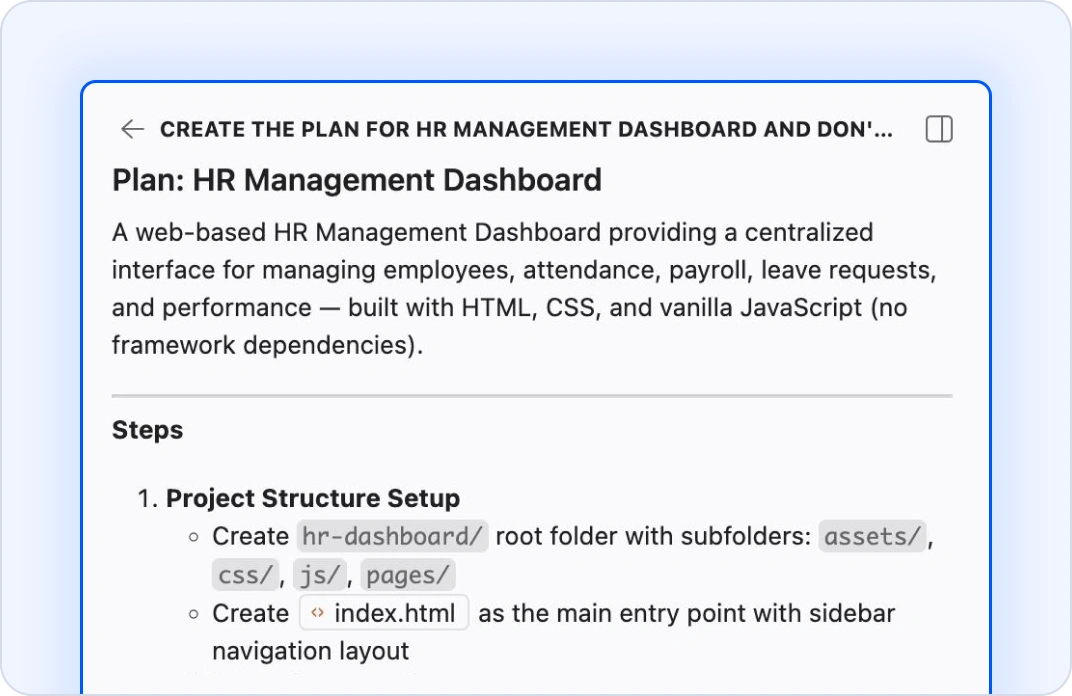 A read-only planning mode that maps your full implementation files, logic, dependencies before the agent writes a single line. Review it. Refine it. Then execute.