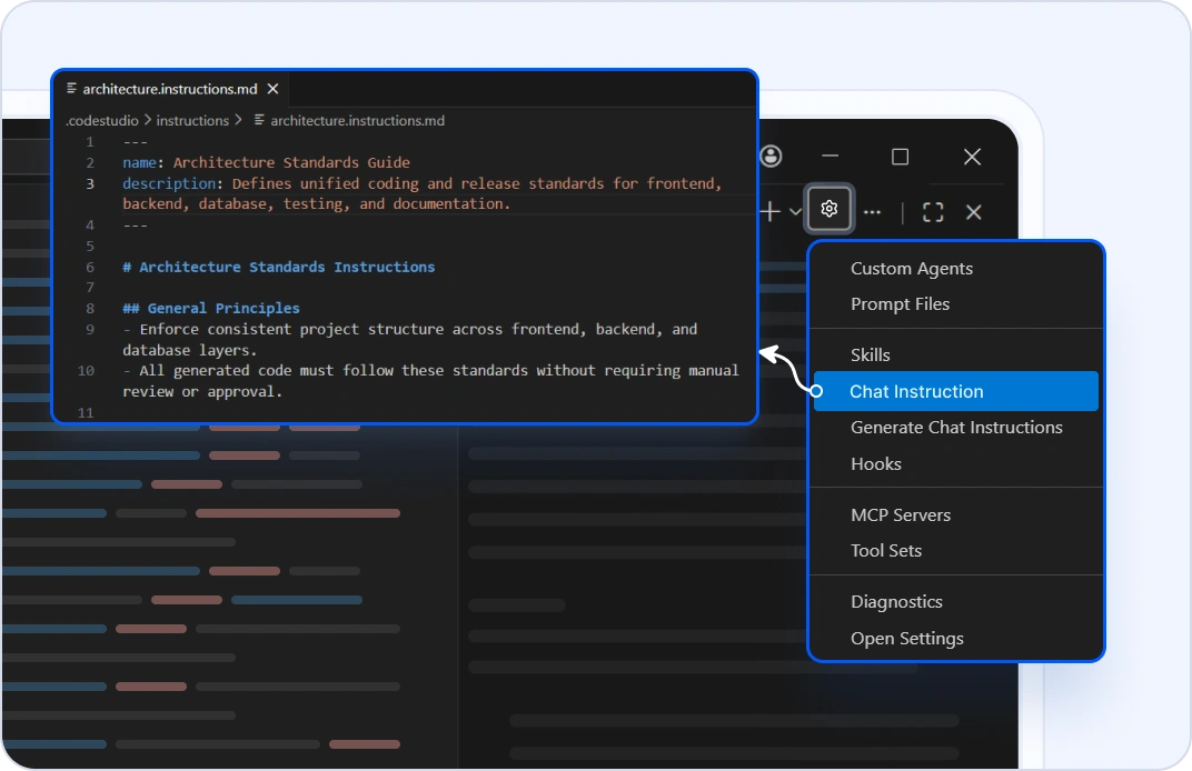 Define architecture standards once as custom chat instructions. Code Studio applies them automatically every time teams generate code. No reviews, no approvals.