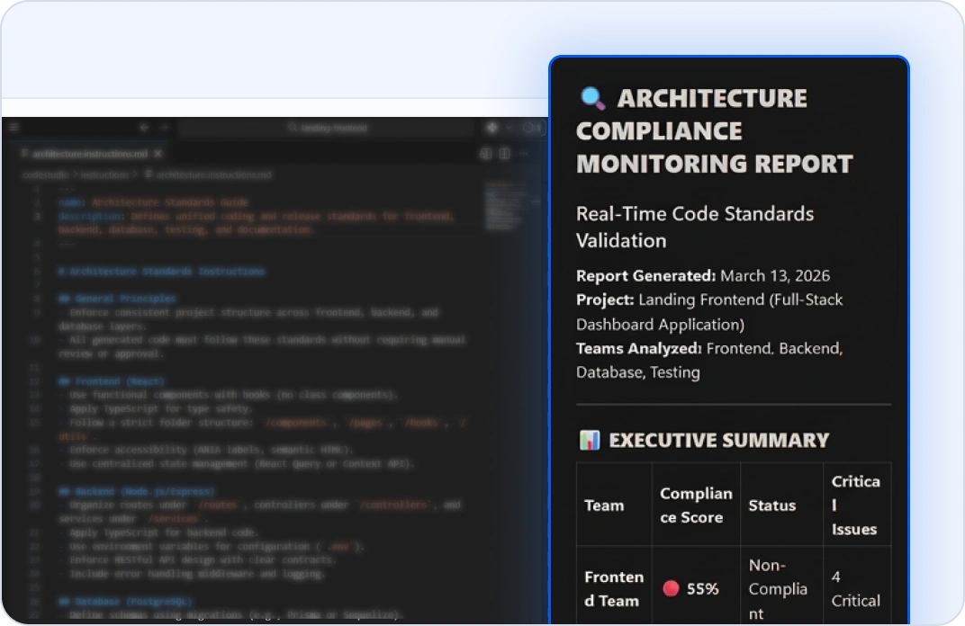 Agent mode monitors code generation autonomously. Know instantly which teams align with your standards and where drift exists.