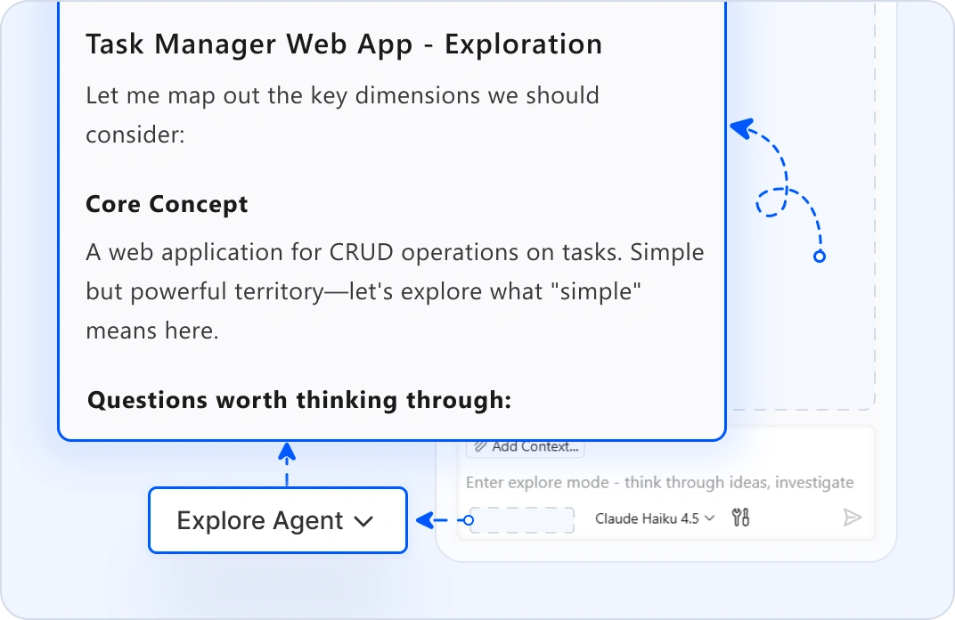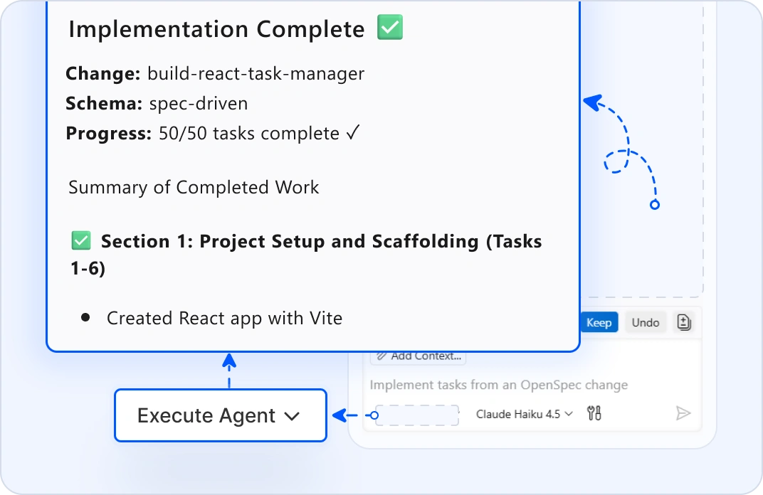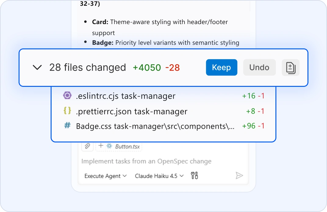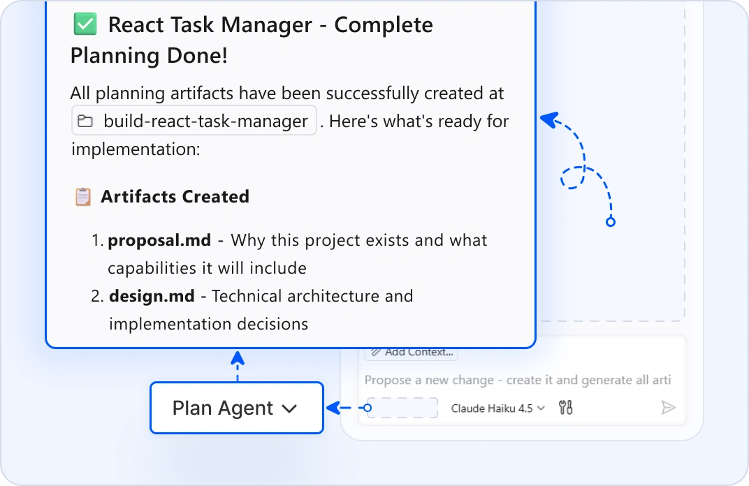 Turn ideas into structured specs with a clear roadmap, architecture, and task breakdown. Align your team before any code is written and eliminate duplicated work by starting with a well-defined plan.