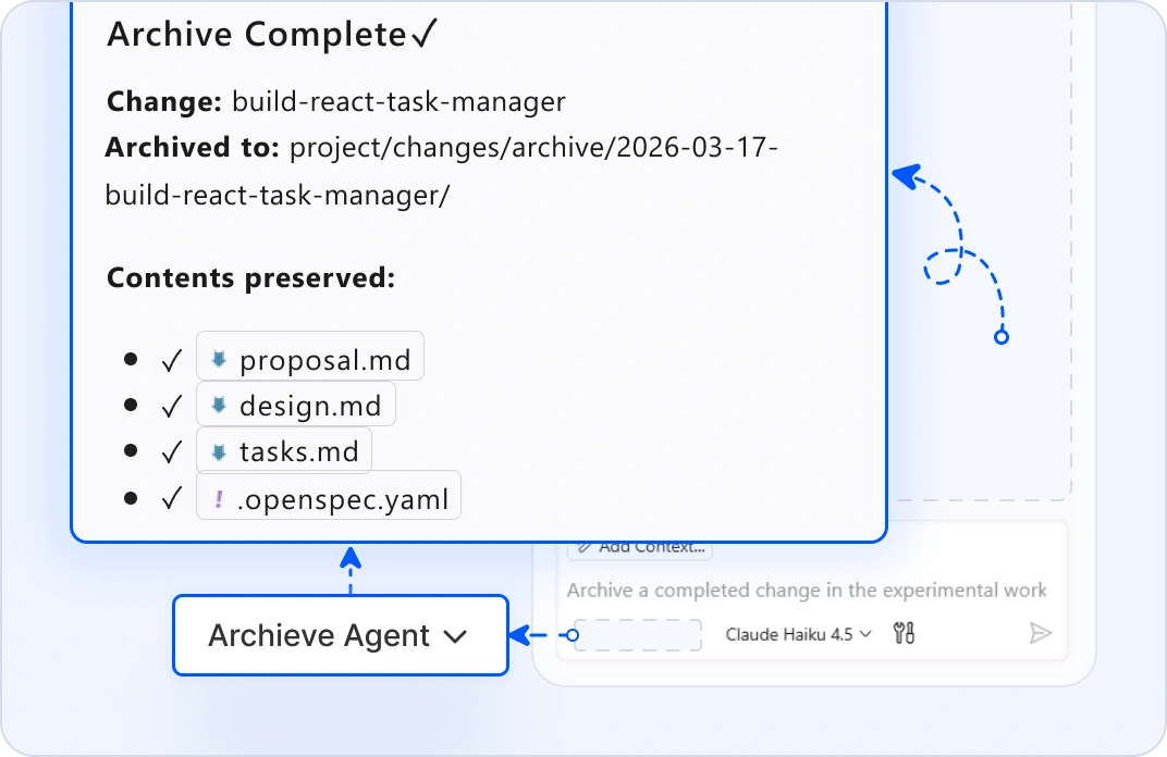 Every spec becomes living documentation. Capture decisions, stay aligned with your code, and make it easy for new developers to understand what was built and why.