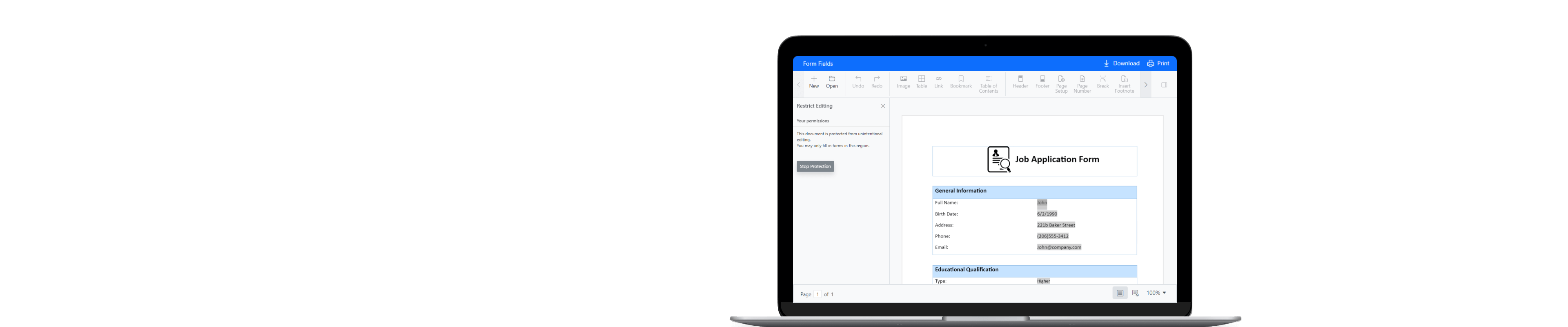 The ASP.NET Core Word Processor component has an intuitive UI for designing a fillable form in a Word document by inserting legacy form fields. The legacy form fields allow you to design: