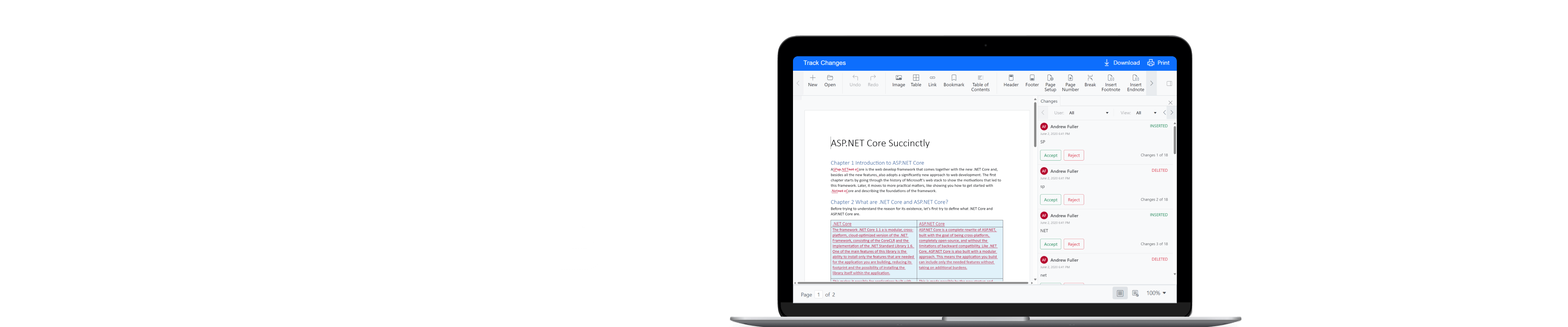 The ASP.NET Core Word Processor component supports a track changes feature that tracks all insertions and deletions made to the Word document. You can see what was inserted or deleted in a specific document by whom and when. It also allows you to accept or reject the changes made.