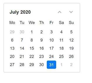 <SfCalendar TValue="DateTime?" Min="@(new DateTime(2020, 7, 1))" Max="@(new DateTime(2020, 7, 31))" FirstDayOfWeek="1" IsMultiSelection="false"> </SfCalendar> |