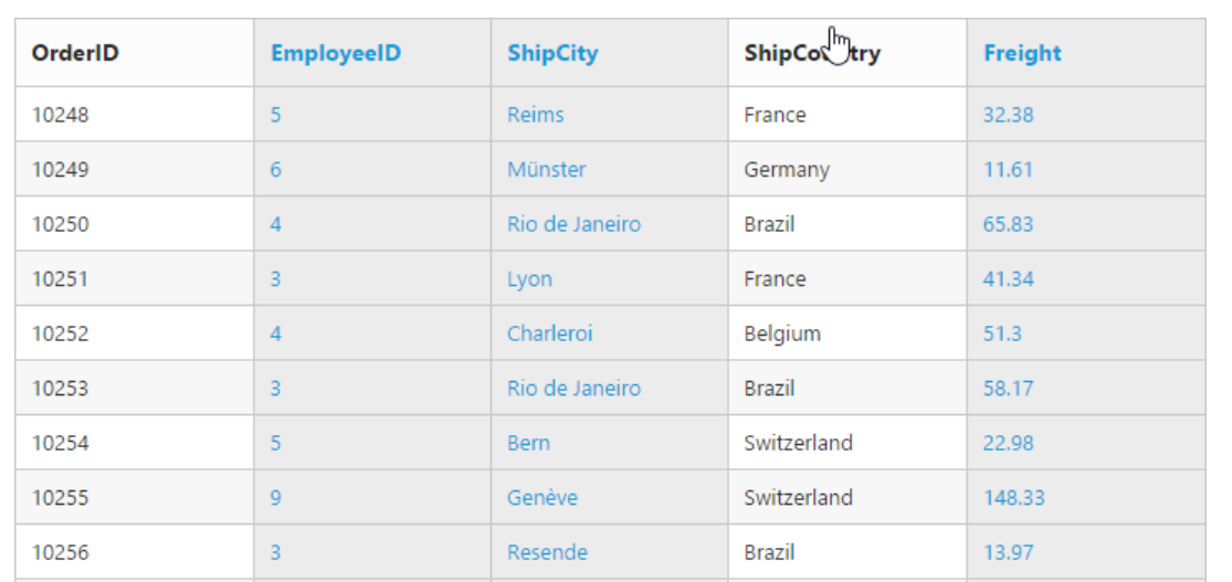 Refer to the attached screenshot. In which EmployeeID, ShipCity, and Freight columns are selected in the Grid