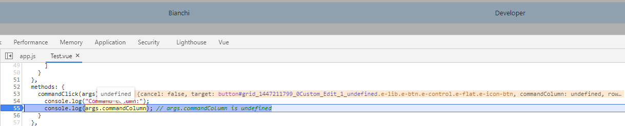 <template><ejs-grid:dataSource="gridData":commandClick="commandClick"><e-columns><e-column field='Name' headerText='Name' width="120"></e-column><e-column field='Surname' headerText='Surname' width="120"></e-column><e-column field='RoleId' headerText='Role' width="120"foreignKeyField="Id"foreignKeyValue="Name":dataSource="rolesData"></e-column><e-column width="120" :commands="commands"></e-column></e-columns></ejs-grid></template><style>@import '../node_modules/@syncfusion/ej2-base/styles/fabric.css';@import '../node_modules/@syncfusion/ej2-buttons/styles/fabric.css';@import '../node_modules/@syncfusion/ej2-calendars/styles/fabric.css';@import '../node_modules/@syncfusion/ej2-dropdowns/styles/fabric.css';@import '../node_modules/@syncfusion/ej2-inputs/styles/fabric.css';@import '../node_modules/@syncfusion/ej2-navigations/styles/fabric.css';@import '../node_modules/@syncfusion/ej2-popups/styles/fabric.css';@import '../node_modules/@syncfusion/ej2-splitbuttons/styles/fabric.css';@import "../node_modules/@syncfusion/ej2-vue-grids/styles/fabric.css";</style><script>import Vue from "vue";import { GridPlugin, CommandColumn, ForeignKey} from '@syncfusion/ej2-vue-grids';Vue.use(GridPlugin);export default {data() {return {gridData: [{ Name: "Mario", Surname: "Rossi", RoleId: 1},{ Name: "Stefano", Surname: "Bianchi", RoleId: 2 }],rolesData: [],commands: [{type: "Custom_Edit",title: "Edit",buttonOption: { cssClass: "e-flat", iconCss: "e-edit e-icons" }}]}},methods: {commandClick(args) {console.log("Command column:");console.log(args.commandColumn); // args.commandColumn is undefined}},provide: {grid: [CommandColumn, ForeignKey]},created() {var that = this;// Async API callsetTimeout(function() {that.rolesData = [{ Id: 1, Name: "CEO" },{ Id: 2, Name: "Developer"}]}, 500);}}</script>