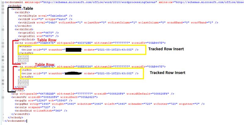 Tables rows show as individual tracked changes