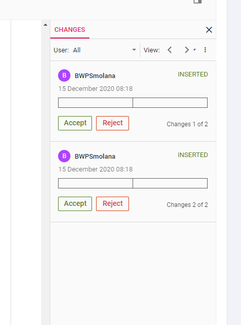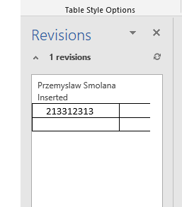 In the track changes panel, we should see one change which is inserted table and then when I insert text in a new table and don't see changes.